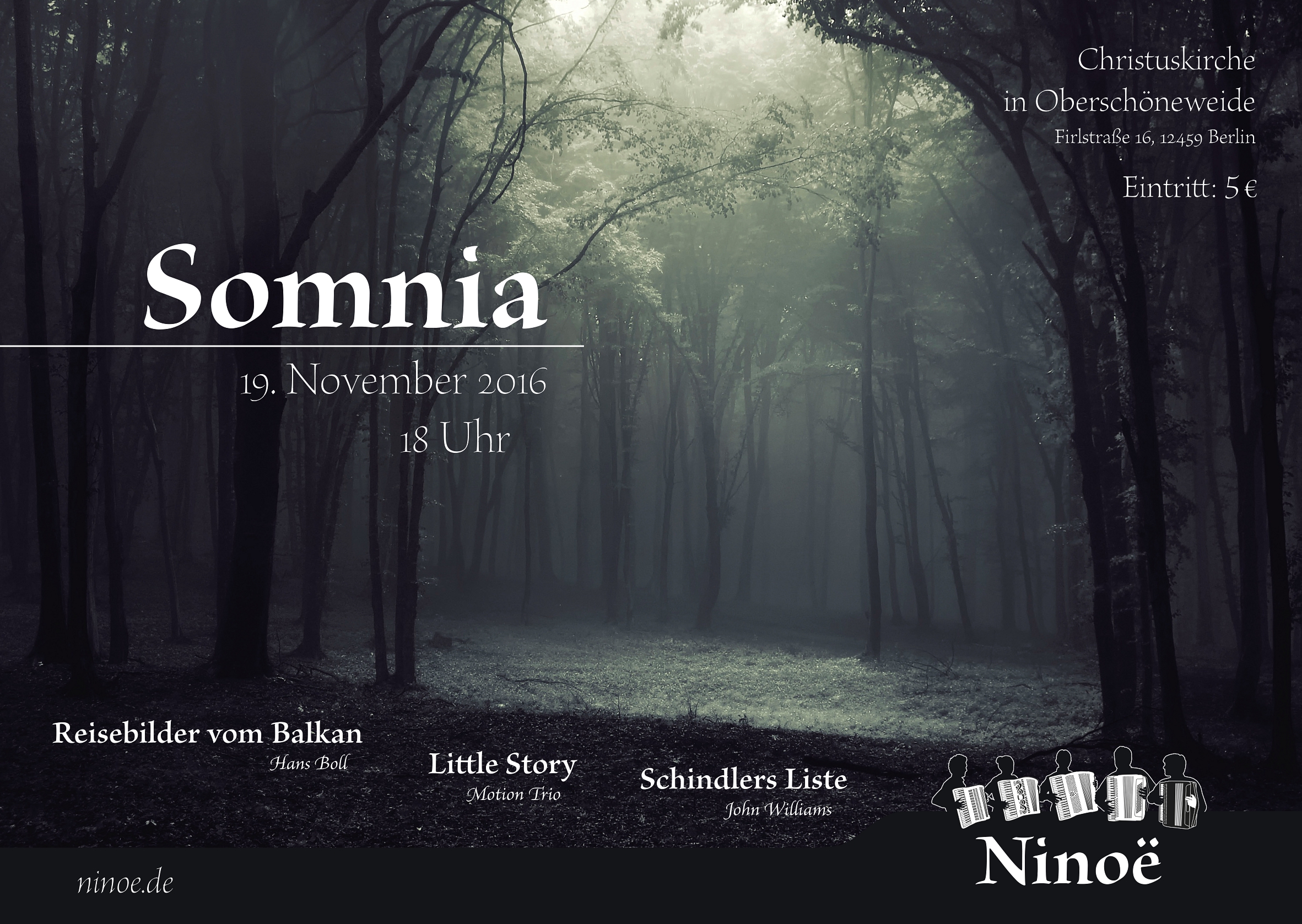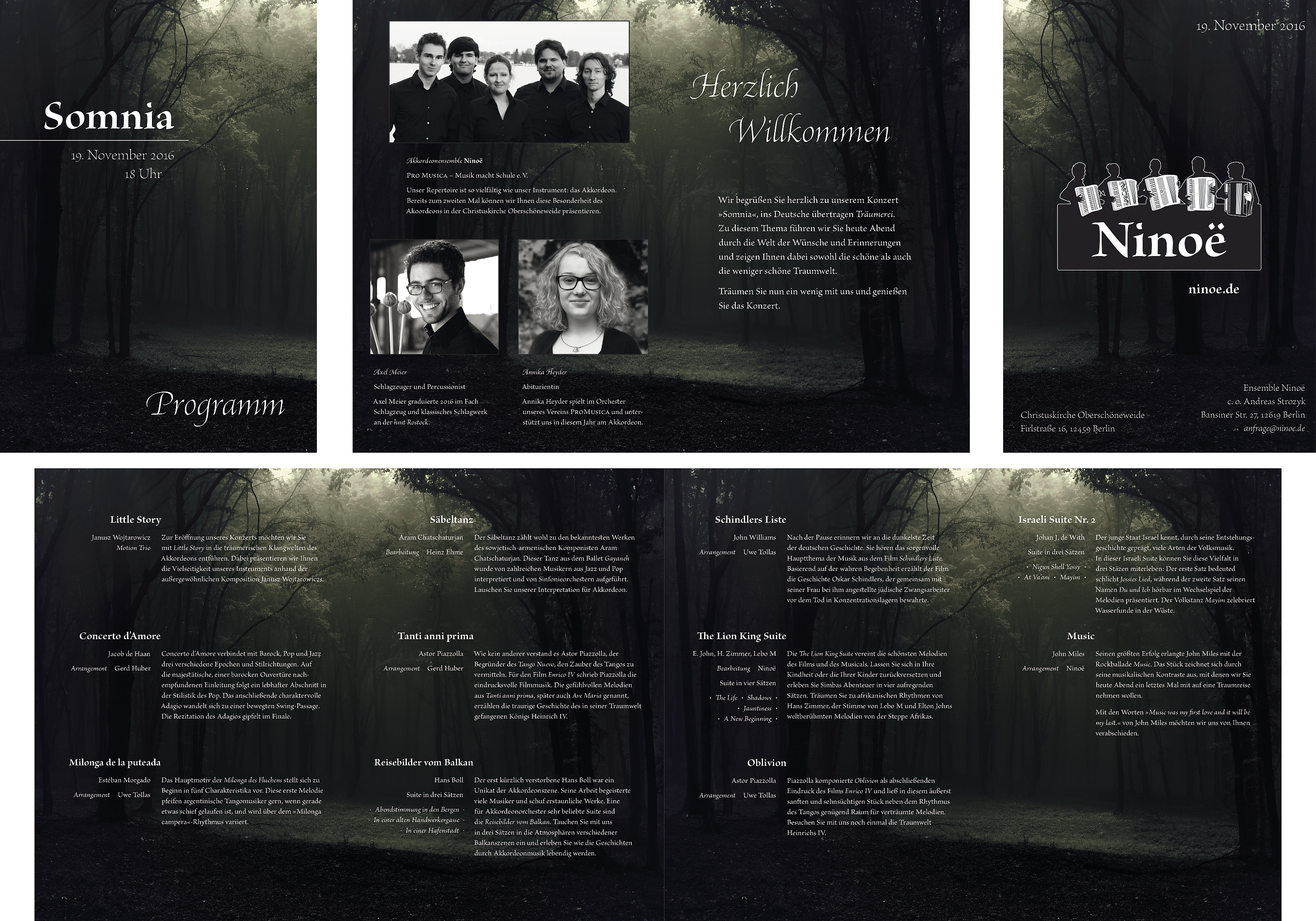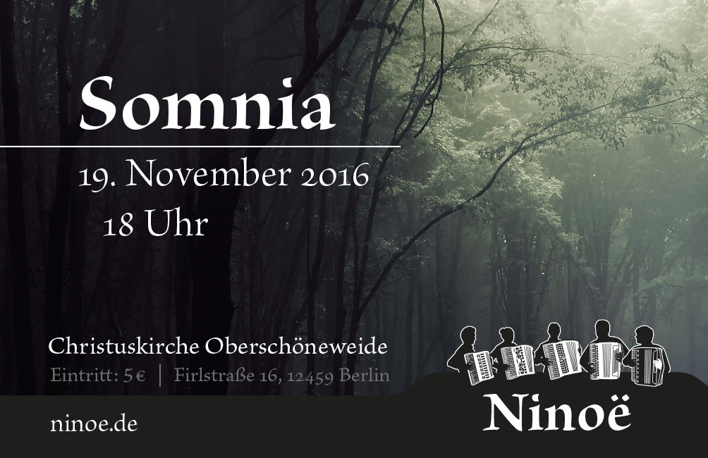 The second concert »Somnia« had an autumnal and gloomy atmosphere. The design reflected this utilising a forest photography with a low saturation and a single hightlighting colour.