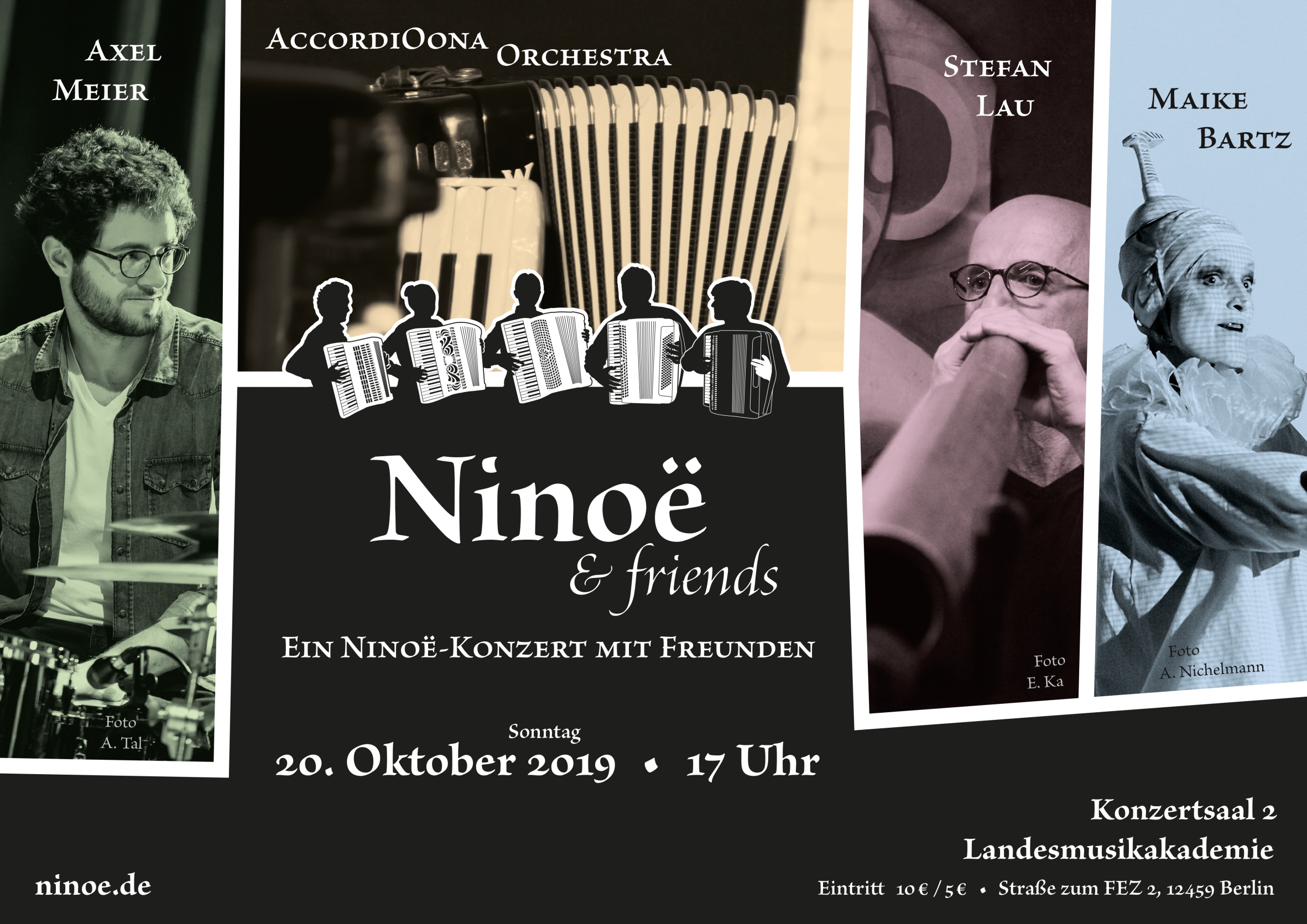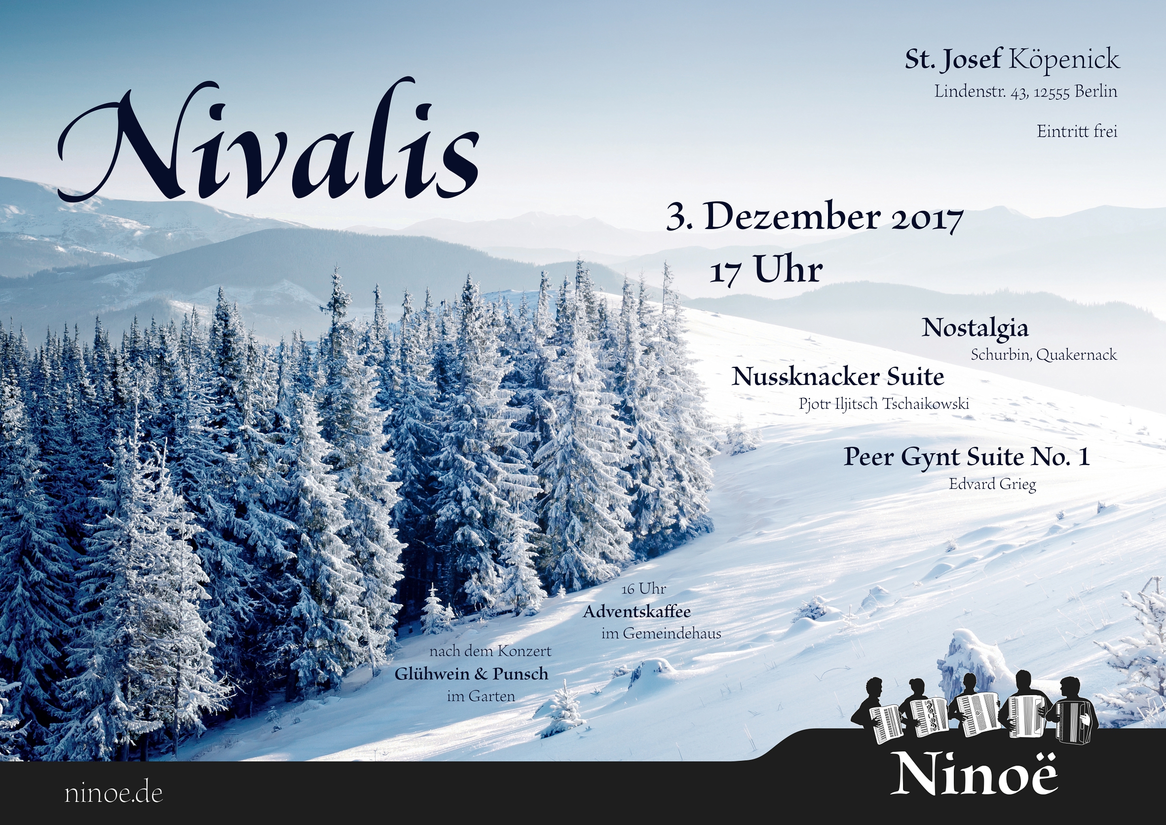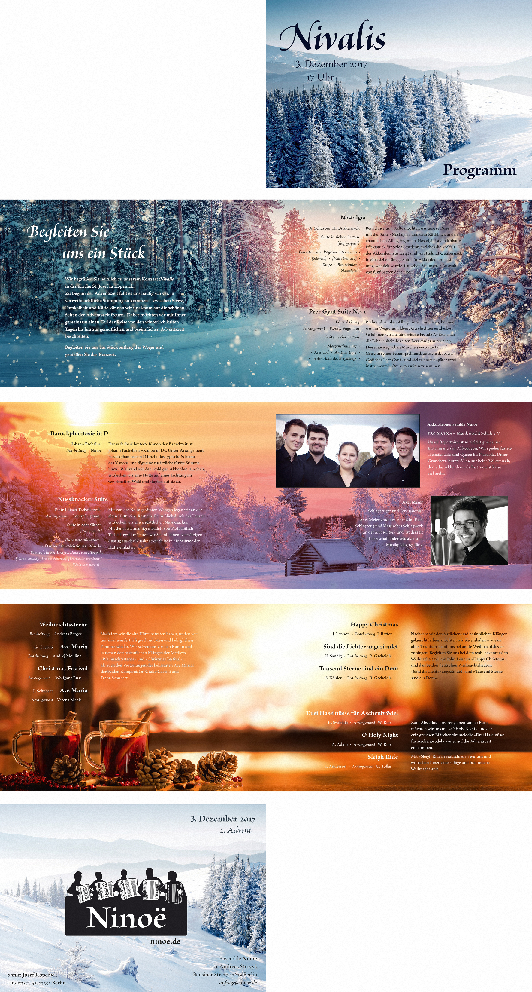 Starting with multiple design sketches, I designed and implemented the website of the accordion ensemble Ninoë. The main theme is a full-size photography style combined with fine typography.